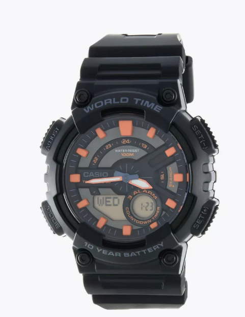 Кварцевые мужские наручные часы Casio AEQ-110W-1A2 с цифровой+стрелочной индикацией времени. Калибр механизма — 5479. Функциональность данной модели: формат времени 12/24, функция летнего времени (DST), мировое время 30 городов (29 часовых поясов), вечный календарь до 2099 года, 3 независимых будильника, сигнал начала часа, секундомер с точностью 1/100 секунды и измерением до 23 часов 59 минут 59,99 cек., таймер обратного отсчета (диапазон времени 24 часа), записная книжка телефонных номеров на 30 записей, люминесцентное напыление на стрелках и метках часов (светятся в темноте). Водонепроницаемость WR100 (10 атм). Батарейка на 10 лет работы.