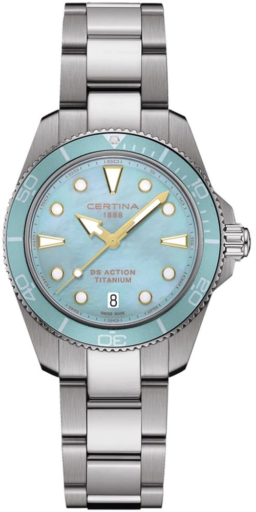 Certina DS Action Lady C048.210.44.131.00 – элегантные женские часы, сочетающие изысканный стиль и высокую функциональность. Корпус диаметром 34,5 мм выполнен из титана, что обеспечивает лёгкость, прочность и гипоаллергенные свойства. Перламутровый циферблат украшен метками с люминесцентным покрытием, обеспечивающим отличную читаемость в любых условиях, и защищён сапфировым стеклом с антибликовым покрытием, устойчивым к царапинам. Безель с PVD-покрытием. Часы оснащены швейцарским кварцевым механизмом ETA F05.412 с технологией Precidrive™, обеспечивающей высокую точность хода. Функция EOL (индикатор окончания заряда батареи) своевременно предупреждает о необходимости замены элемента питания. Браслет из титана оснащён системой быстрой замены, позволяющей легко менять ремешки без использования инструментов. Водонепроницаемость 300 метров (30 бар) делает эту модель идеальным выбором для плавания и дайвинга.