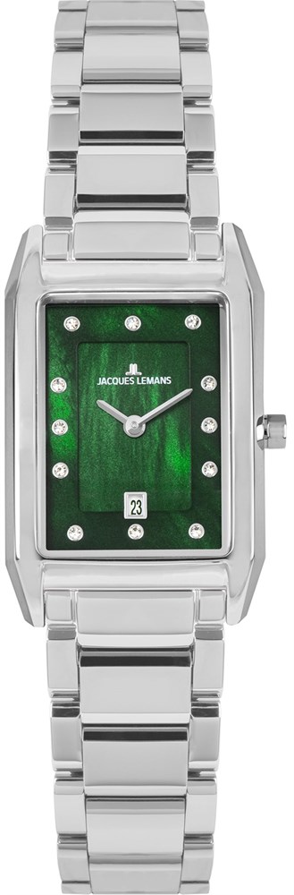 Серия 1-2189 включает классические часы, которые вы будете с удовольствием надевать каждый день. Удобный корпус (23х35 мм) в форме стильного прямоугольника сделан из гипоаллергенной нержавеющей стали, материала, который способен сопротивляться появлению микроцарапин. Минеральное стекло защищает зеленый двухуровневый циферблат из натурального перламутра. Точно определить время помогут сверкающие кристаллы, выполняющие роль индексов часов. На 6 часах расположено окошко даты с накладной рамкой. Ремешок сделан из натуральной кожи зеленого цвета, застежка-пряжка украшена логотипом бренда Jacques Lemans.