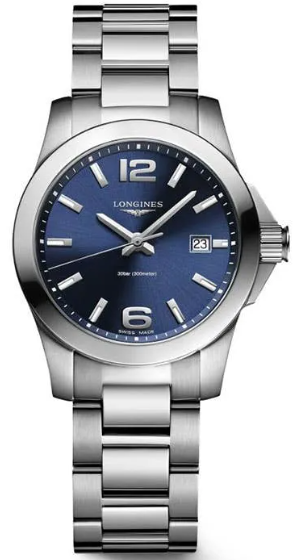 Часы Longines Conquest (артикул L33764966) сочетают в себе спортивную элегантность и функциональность, характерные для коллекции Conquest. Корпус диаметром 29,5 мм выполнен из нержавеющей стали с водозащитой до 30 бар (300 метров). Завинчивающаяся заводная головка и задняя крышка подчёркивают практичность. Синий циферблат с солнечным узором оснащён накладными арабскими цифрами и индексами, стрелками с люминесцентным покрытием, а также окошком даты в положении «3 часа». Циферблат защищён сапфировым стеклом с антибликовым покрытием.