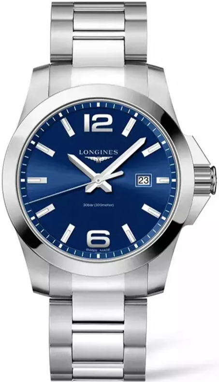 Часы Longines Conquest (артикул L37604966) сочетают спортивную элегантность и высокую функциональность, характерные для коллекции Conquest. Корпус диаметром 43 мм выполнен из нержавеющей стали с водозащитой до 30 бар (300 метров). Завинчивающаяся заводная головка и задняя крышка подчёркивают надёжность. Синий циферблат с солнечным узором оснащён накладными арабскими цифрами и индексами, стрелками с люминесцентным покрытием, а также окошком даты в положении «3 часа». Циферблат защищён сапфировым стеклом с антибликовым покрытием.
