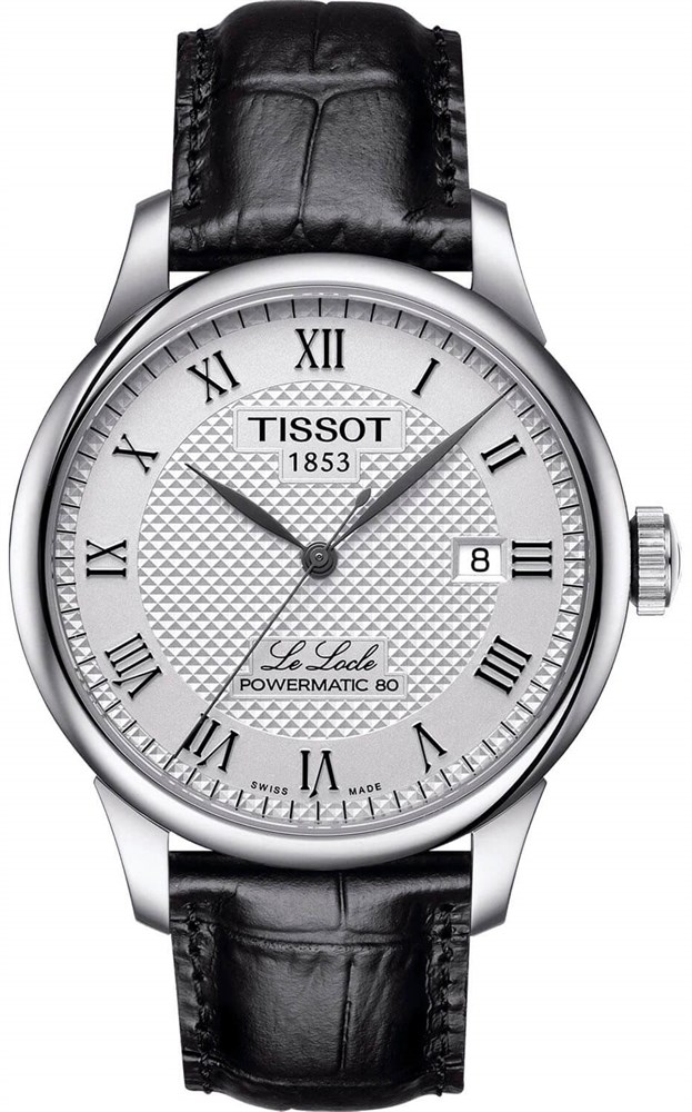 Tissot Le Locle. Выпуск часов был посвящён 150-летию марки Tissot, характерными чертами коллекции стали циферблат с узором, римские цифры, элегантное оформление. Задняя крышка корпуса с изящными узорами. Использован механизм Powermatic 80, сохраняющий запас хода до 80 часов. Сапфировое стекло невозможно поцарапать. Индикация даты. Прочный ремешок из натуральной кожи.