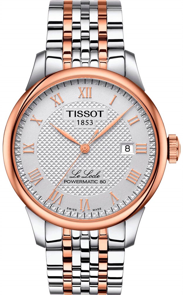 Tissot Le Locle. "Юбилейная" модель имеет стальной браслет с защитным PVD-покрытием, повышающим износоустойчивость материала. Взгляд приковывает оформление циферблата, тонкие изящные стрелки, задняя крышка с фирменной гравировкой. Отображение даты. Автоматический механизм Powermatic 80. Водонепроницаемость 30 метров. Сапфировое стекло с антибликовым покрытием.